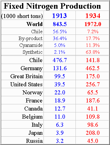 To compete with this, other countries copied the process and quickly scaled up their own synthetic ammonia production capabilities. When the war was over, fixed nitrogen continued to be produced in large amounts because of its use as a fertilizer. By 1934 Chile was supplying only 7% of the worlds fixed nitrogen (a huge drop from the 56% supplied in 1913). Synthetic ammonia production had arrived in force.