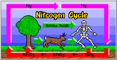 Converting nitrogen gas into more reactive (and useful) nitrogen compounds, such as ammonia, encompasses the first stage in the "nitrogen cycle". Once converted from its gaseous form, fixed nitrogen compounds allow plants to grow large and healthy. Animals gain access to this nitrogen by eating the plants, and deposit excess nitrogen in their feces. Fixed nitrogen is also returned to the soil when plants and animals die. Bacteria then decompose this organic matter first into ammonia, then into nitrites (like potassium nitrite: KNO2), and finally into nitrates (like potassium nitrate: KNO3), which are again used by plants. Additional bacteria return some of the fixed nitrogen back to the atmosphere (in the form of nitrogen gas), thereby regulating the whole cycle.
