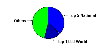 This shows the total population of banks with web sites, split by their size in terms of asset strength. The first section shows that 37% of all the banks are among the five largest in their home markets. The first and second sections together represent 54% of the total - this is the proportion of banks which are among the 1,000 largest in the world. The remaining slice of 46% are in neither of these categories. They are generally the smaller regional or local banks from the USA or Europe.