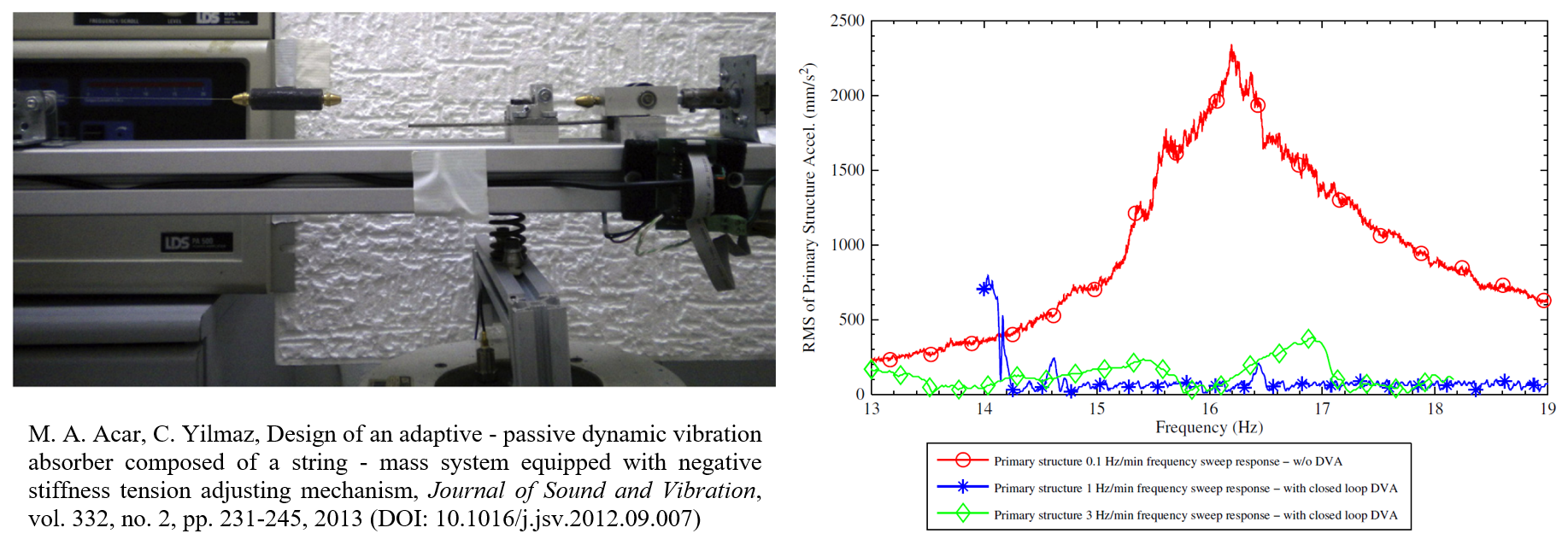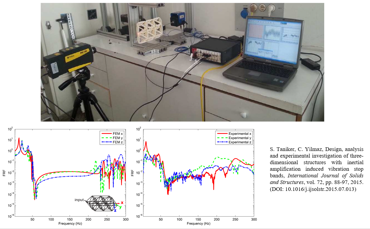 Vibrations Laboratory is equipped with the instrumentation and software required for measurement and analysis of vibrations of structures and machinery. In the lab, there are two shakers for low frequency high force and high frequency low force applications, an impact hammer, data acquisition systems, accelerometers, a laser vibrometer, a quasi-zero stiffness vibration isolation platform, an oscilloscope, and other miscellaneous electrical and mechanical measurement instruments. Current research in the lab focuses on computational and experimental investigation of vibration isolation systems, passive and adaptive vibration absorber systems, phononic band gap structures and elastic metamaterials.